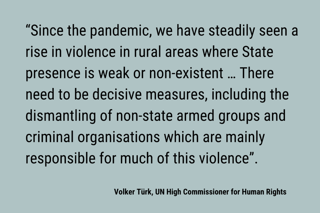 Türk stated the need to join efforts to put an end to the levels of violence that communities experience from diverse armed groups that include displacement, confinement, gender, and sexual-based violence, and massacres.