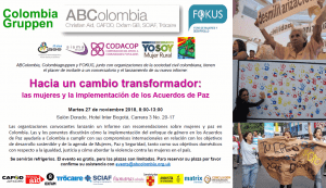 El martes, 27 de noviembre de 2018, ABColombia, Colombiagruppen y FOKUS, junto a CIASE, CODACOP, Sisma Mujer, la Plataforma de Mujeres Rurales y Tejido Mujer ACIN lanzaron el informe “Hacia un cambio transformador: las mujeres y la implementación de los Acuerdos de Paz en Colombia” con recomendaciones específicas sobre la equidad de género, la protección de las mujeres defensoras de derechos humanos y los compromisos con las mujeres con respecto al desarrollo rural. Aquí puede descargar el informe completo.