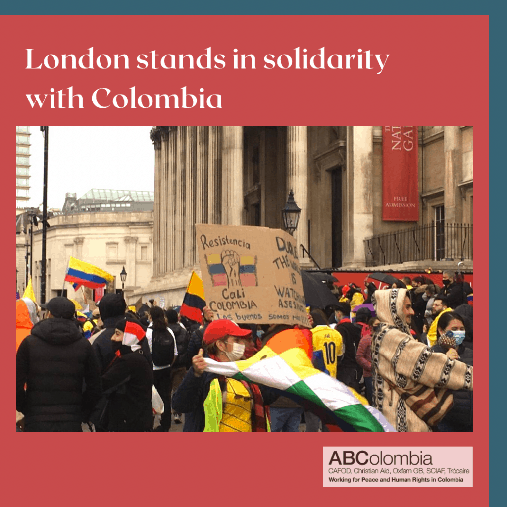 Friends of ABColombia stood amongst the crowds, sharing our recent statement; London and the UK stands with the people of Colombia, strongly rejects the repression they are being faced with, and urges the Colombian government to take steps to protect the rights of its citizens.
