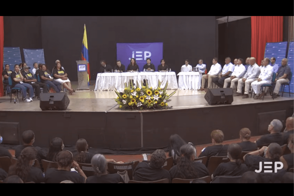 The Special Jurisdiction for Peace (JEP) held an historic hearing in the department of Norte de Santander for the crime against humanity of extrajudicial killings by the Colombian Armed Forces. This hearing is part of a national case (number three) where, so far, the JEP has documented 6,402 civilians extra-judicially executed by State Agents and passed off as combat killings. In this hearing members of the Colombian Army and a civilian acknowledged truth and responsibility for the murders and forced disappearances of 120 civilians, young people lured to Ocaña with the offer of a job, killed and presented as guerrillas killed in combat.